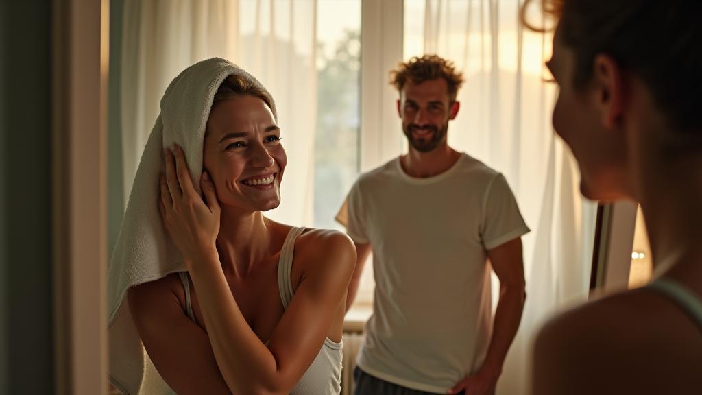 Утром после душа, стоя перед зеркалом, она рассматривала себя, как глупая девчонка, и видела, что она вся стала другая. Глаза другие и вообще.Это невозможно объяснить словами, но она смотрит и видит, что в ней теперь есть ещё одна жизнь и это просто потрясающе!