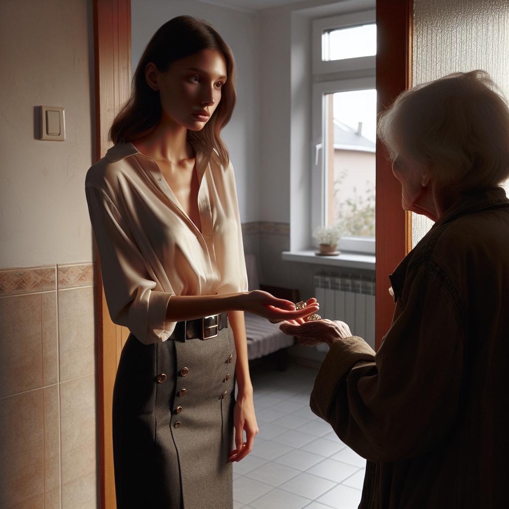 Наверное старушка хотела обменять этот блеснувший в её руке медальончик на еду?