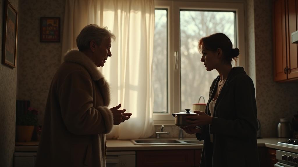 Лена замерла с кастрюлей в руках, не веря своим глазам. Свекровь стояла посреди их кухни в дорогой шубе, сжимая в руке какую-то бумагу. Её лицо пылало от негодования.