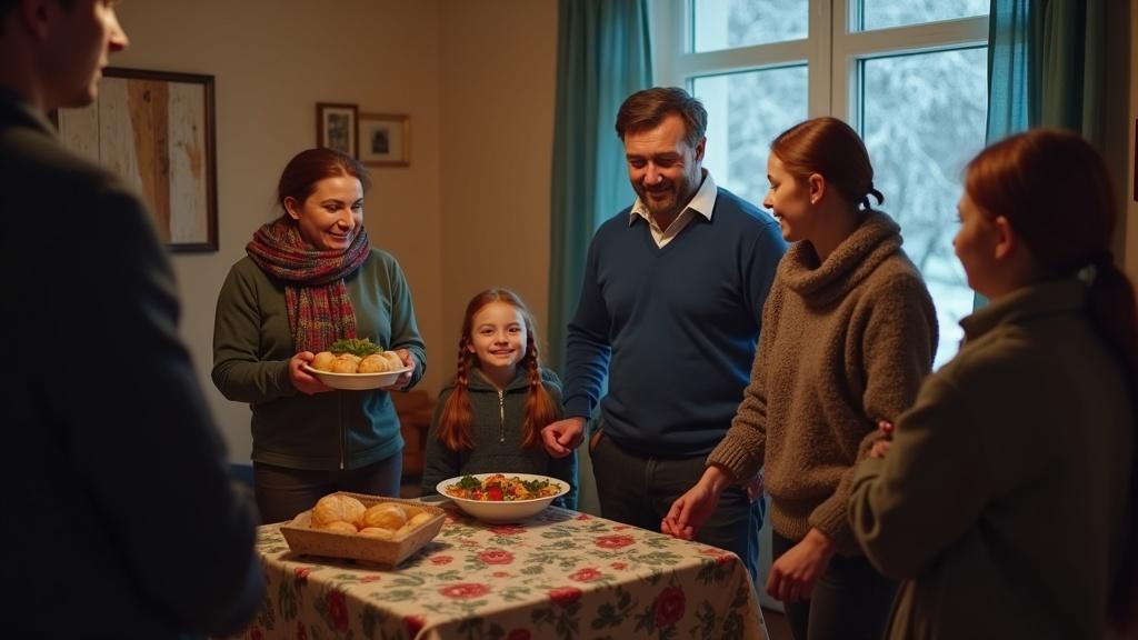 Воробьёвы Ольга и Василий несут салаты, их двенадцатилетняя дочь Вера торжественно держит коробку со сладким пирогом, что испекла мама.