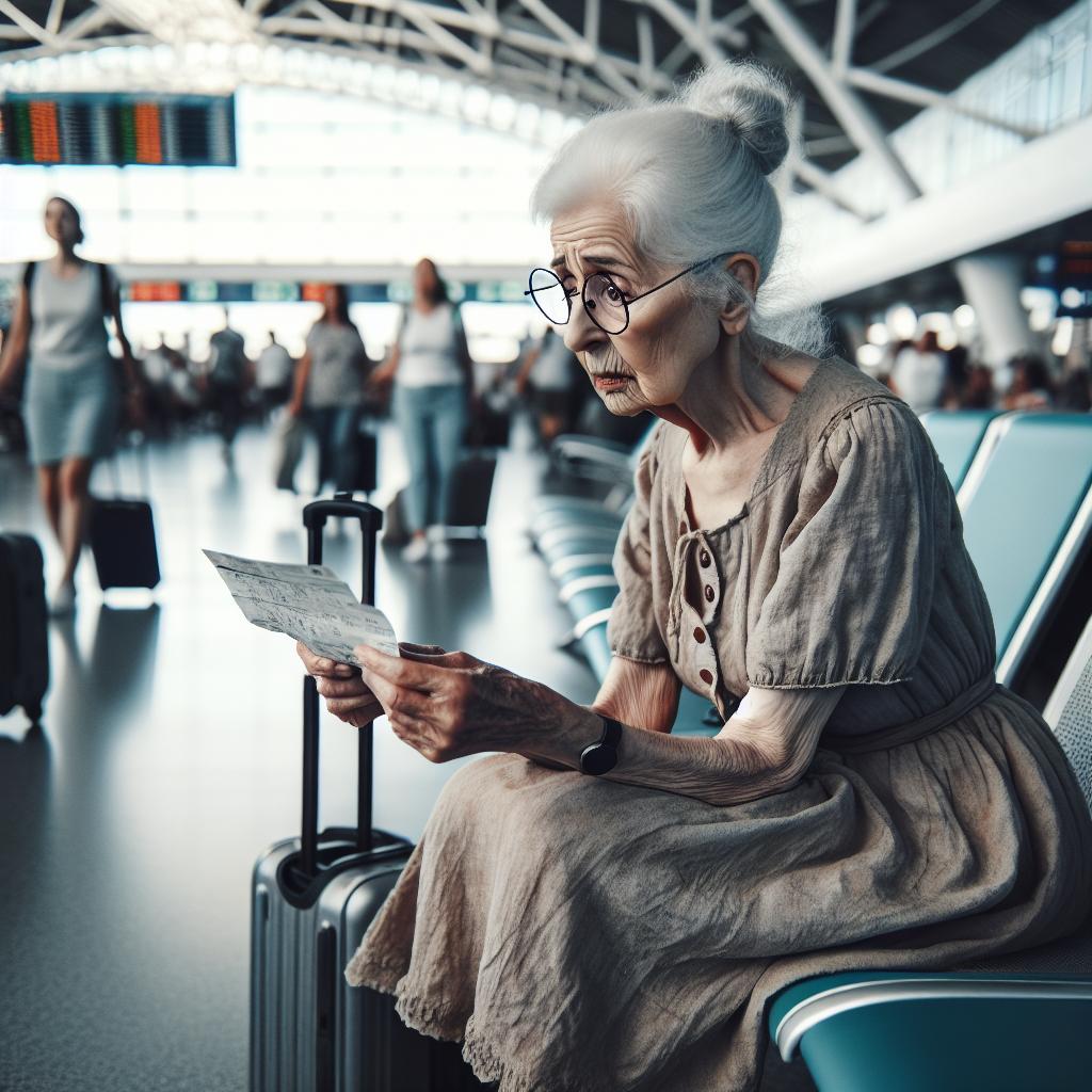Полдень в огромном, шумном здании аэропорта. Пожилая женщина приехала заранее, она очень боится опоздать. Подойдя к таблице расписания рейсов, женщина надела очки и принялась основательно его изучать. Затем достала свой билет и ещё раз всё проверила.