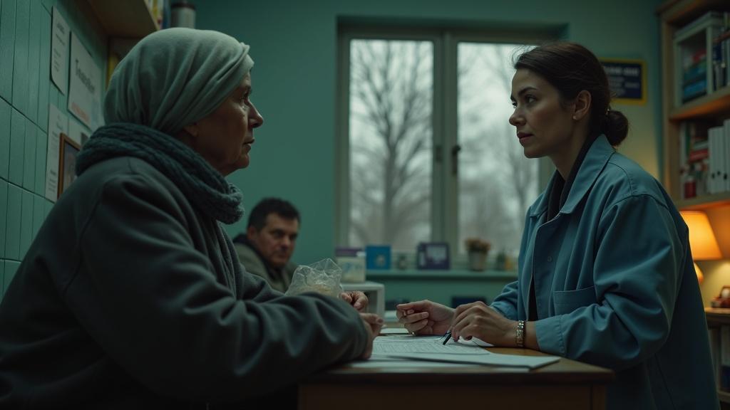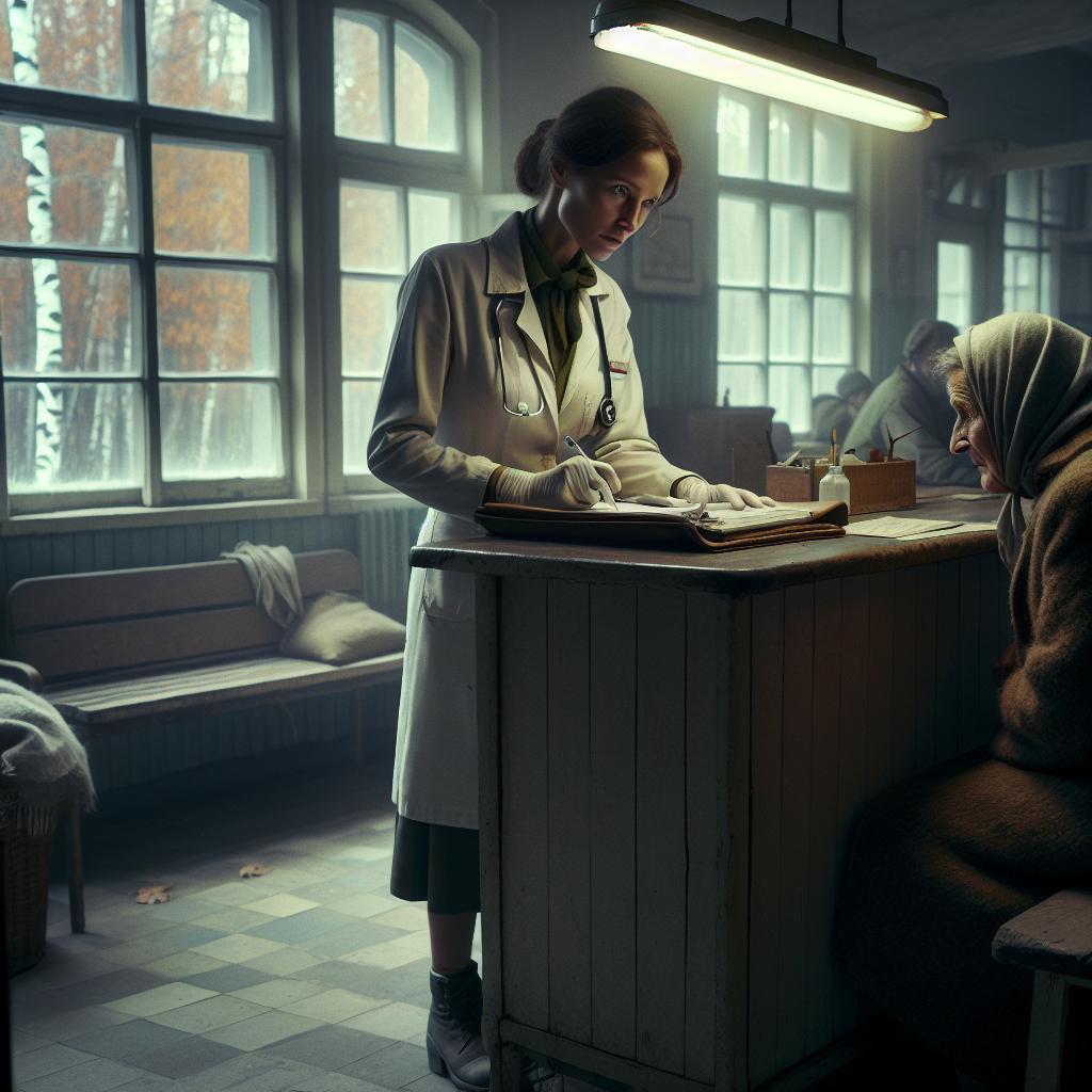 Холодный осенний день. Ветер давно сорвал все листья с деревьев, но снег ещё не выпал. В деревенском фельдшерском пункте на приёме сидит пожилая женщина и, завязав голову тряпкой, стонет.