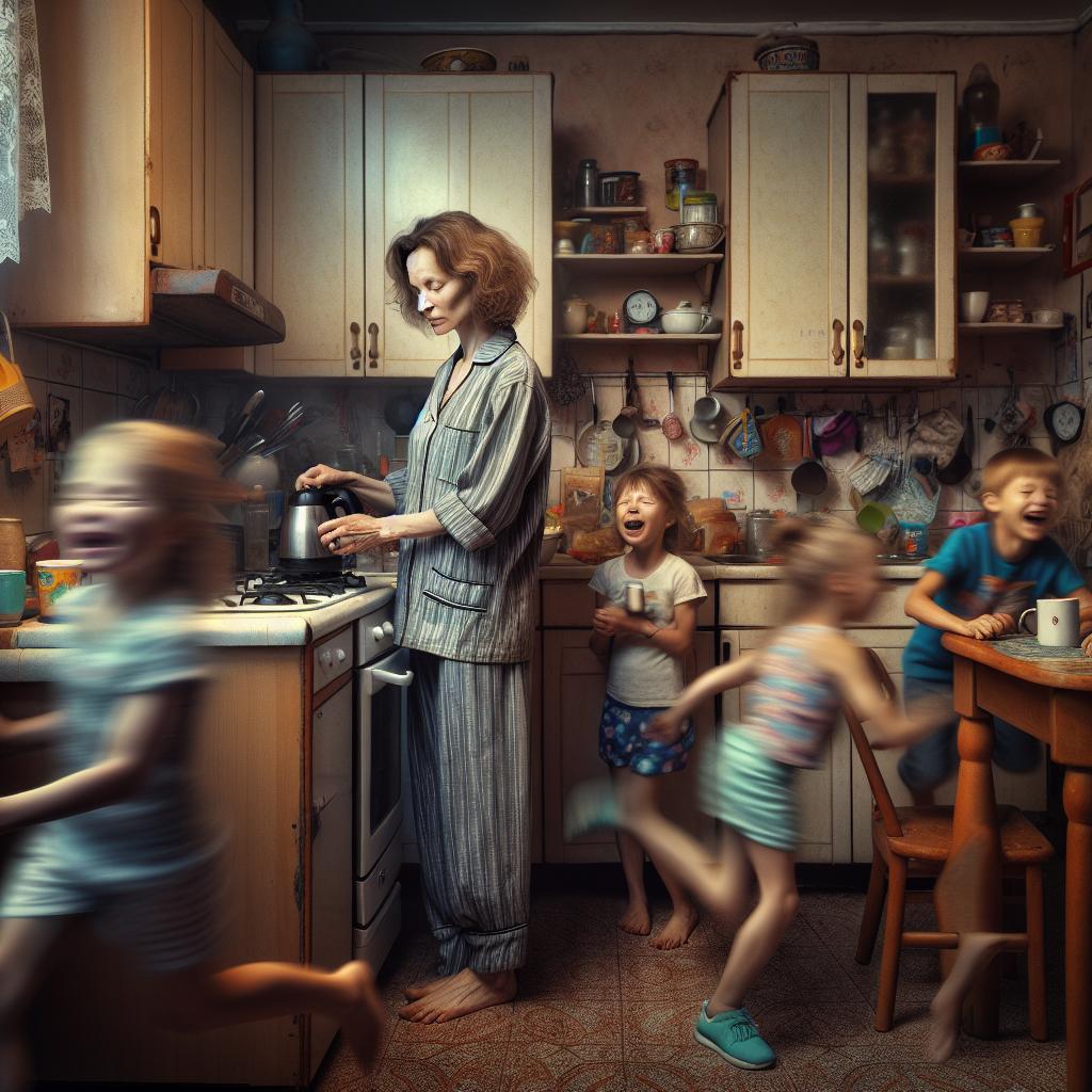 Нет, она конечно кормит их по утрам, даже возможно и омлетом. но делает она это в домашнем костюме, в простонародье пижама и с дулькой на голове. Владька, берёт сына Даньку и дочь Оксанку, бежит скачками, сломя голову, одного в садик закинуть, а другого в школу.