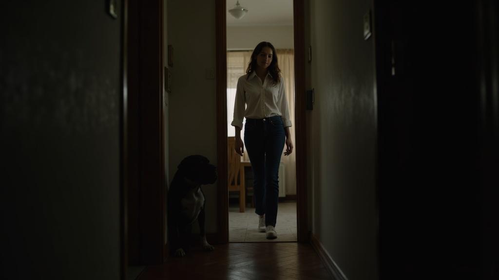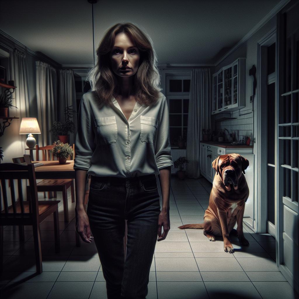 Раф, большой бордосский дог, который всегда несётся навстречу к Катерине, и тот трусливо спрятался где-то в глубинах квартиры.