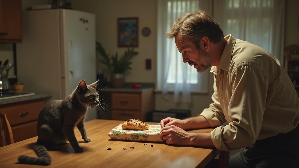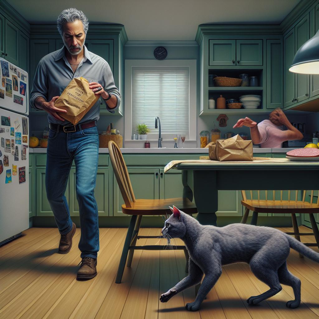 Он подтягивает лапой колбасу поближе к себе и рвёт бумагу. Откусив несколько кусков, он решает унести добычу в удобное место и не спеша там насладиться. Но входит хозяин.