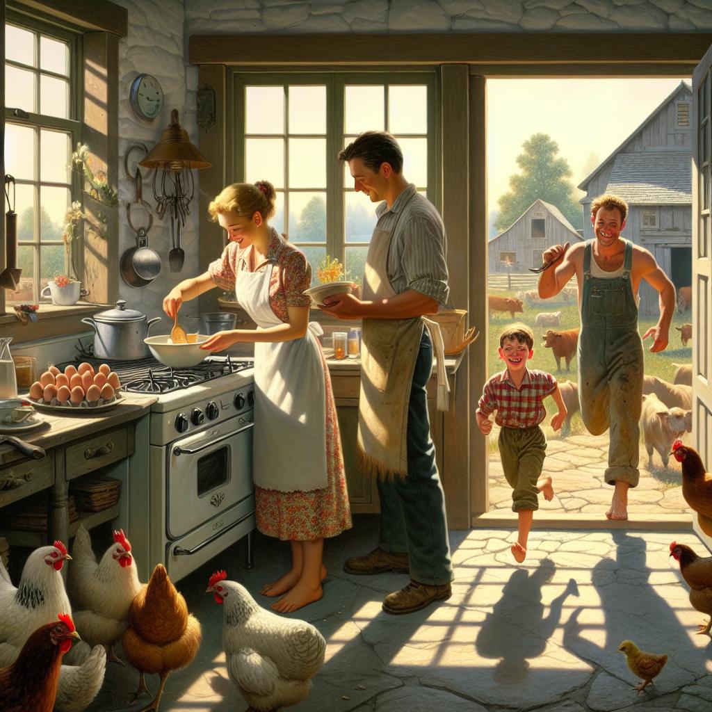 Летнее утро в деревне. Слышны мычание коровы и весёлое кудахтанье пернатой живности. Настя хлопочет у плиты, торопливо готовит завтрак любимым мужчинам. Муж Костя возится в хлеву – кормит корову и кур. Шестиклассник Ваня радостный вбегает в дом с миской яиц.