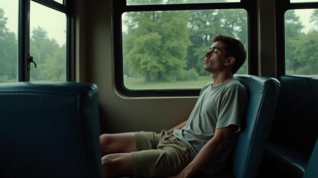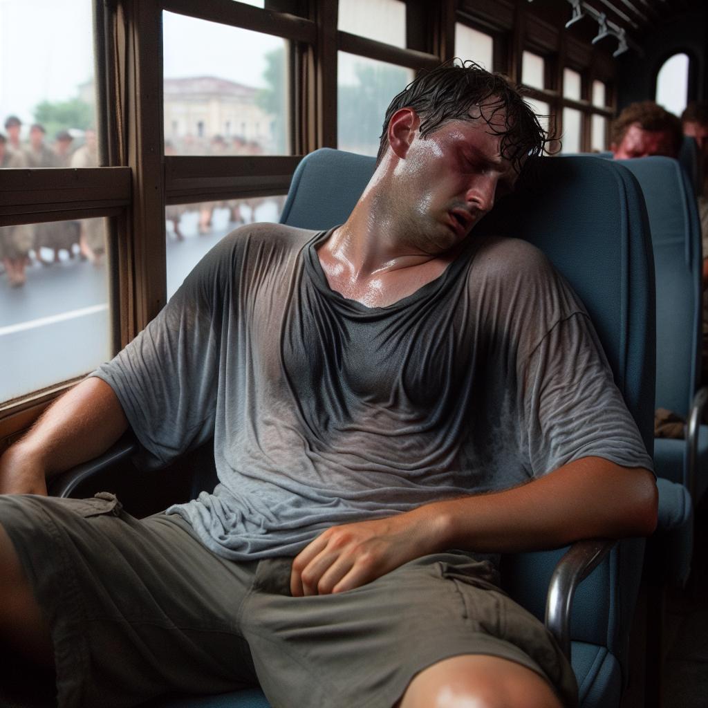 Качаясь, как ребёнок в люльке, он пытается заснуть. Изредка открывает глаза и смотрит на поля и лес за окном. Наконец задремал.