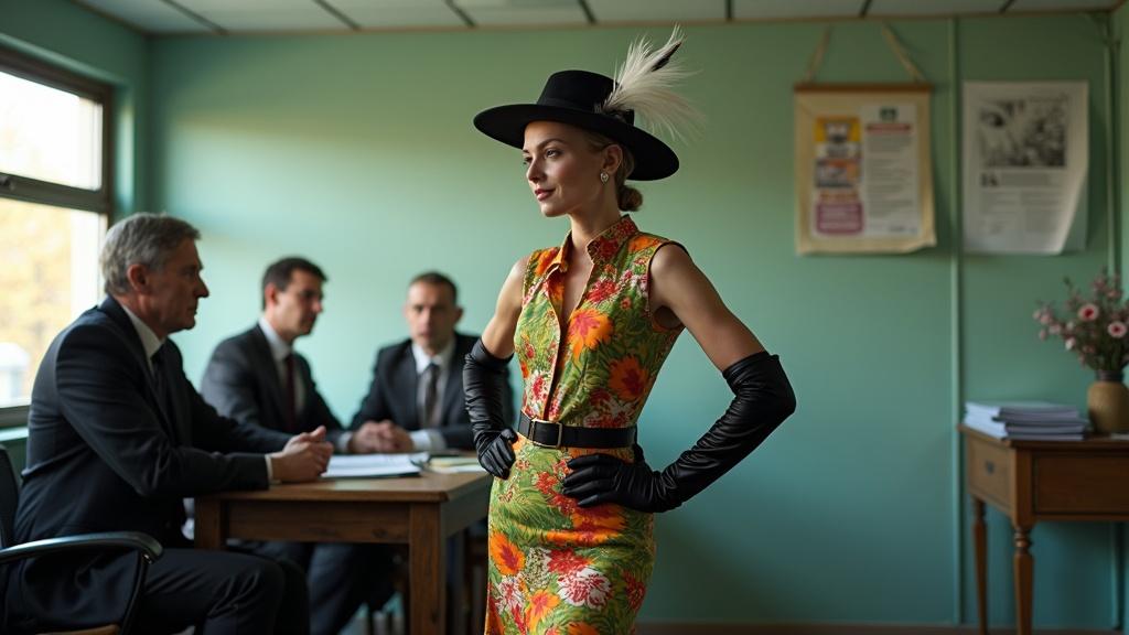 От её локтей до пальцев тянулись чёрные, сильно растянутые атласные перчатки. На голове этой особы сидела большая, словно спутниковая тарелка, шляпа, из которой антенной торчало перо чайки. На вид женщине было глубоко за тридцать пять, но она явно чувствовала себя гораздо моложе.