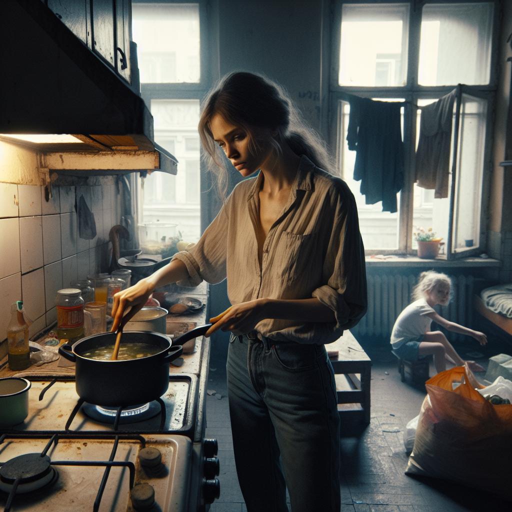 Вероника стояла у плиты, помешивая суп. В соседней комнате играла Мирослава — скакала по ковру, что-то напевала себе под нос. В кухонном окне скапливался вечер: лениво гаснущее солнце и уличный фонарь, мигающий, как старый сигнал тревоги.