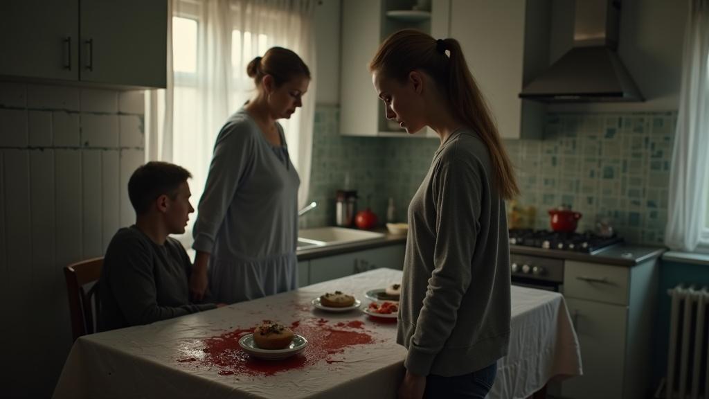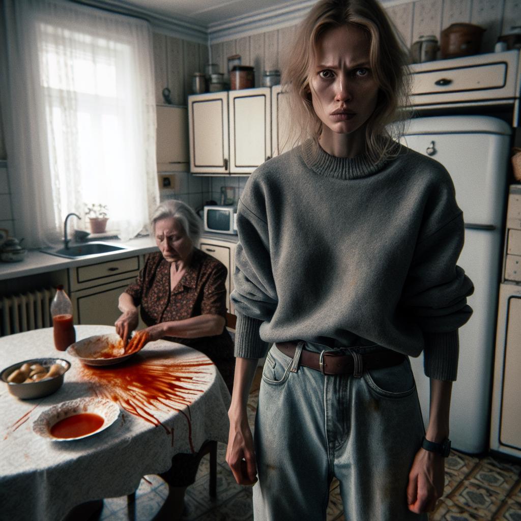 Я вжалась в угол кухни, соус ещё покапывал с края скатерти, алыми пятнами, как кровь.