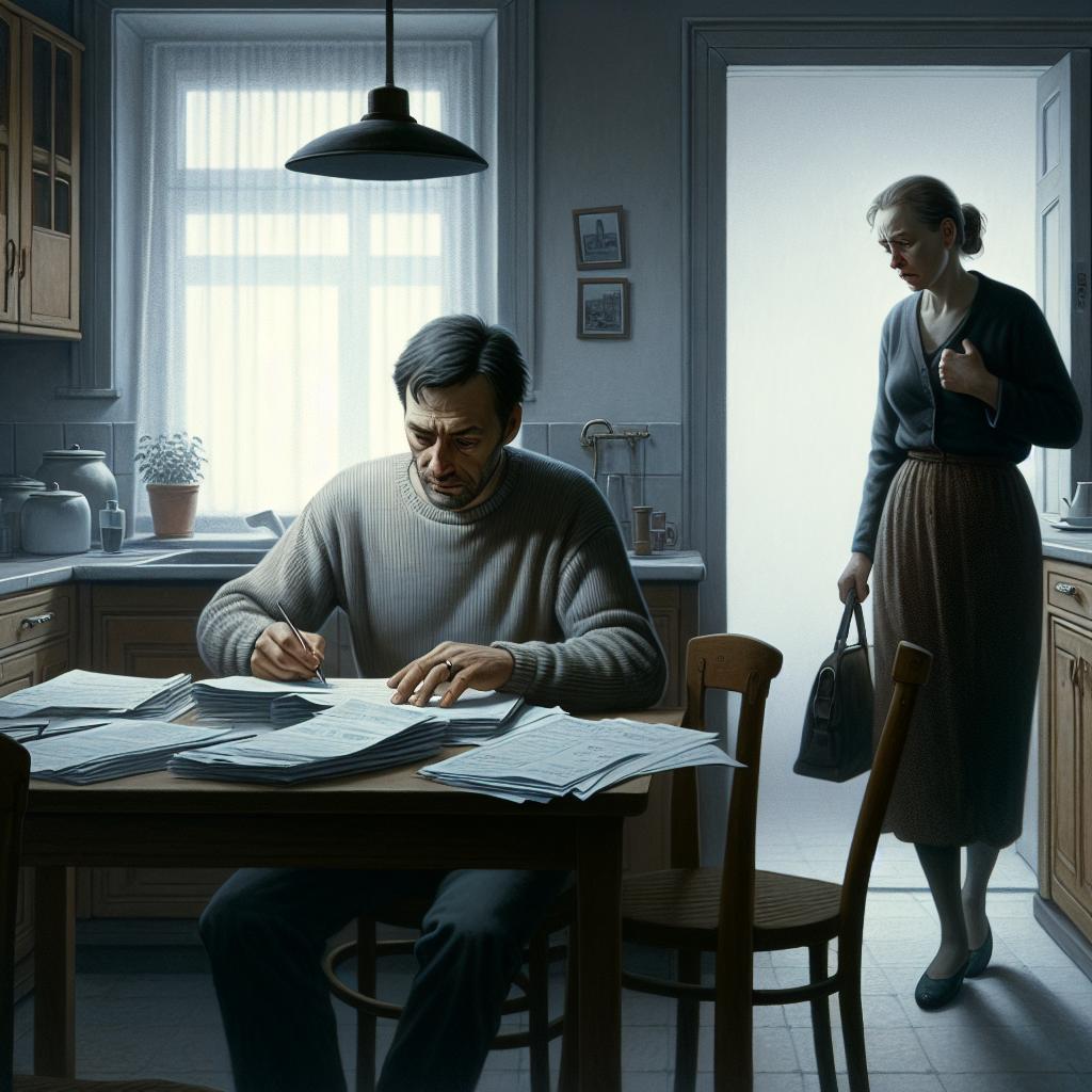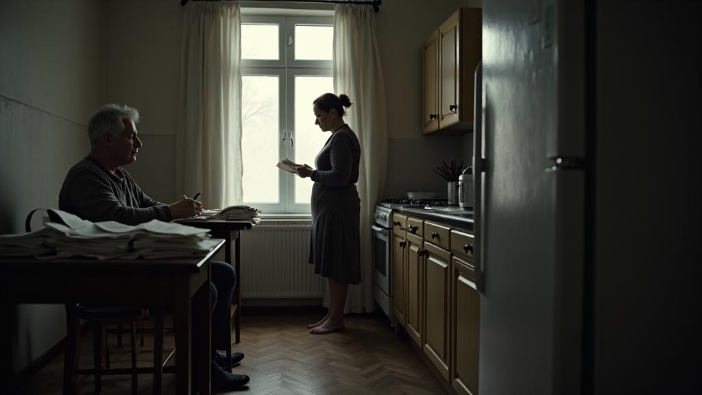 Лариса открыла дверь и почувствовала, как холод дома ударил по лицу. Не просто прохлада — настоящий холод равнодушия. Валерий сидел за кухонным столом, не поднимая головы. Перед ним лежала кипа бумаг, аккуратно разложенных веером.