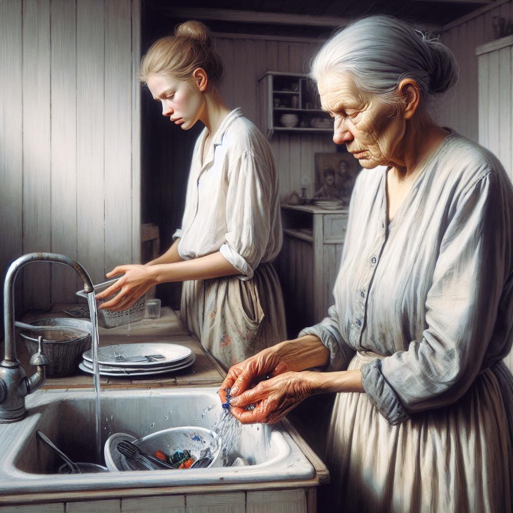 — Неужели сложно насухо вытереть тарелки? Что за неряха растёт! — громогласно возмущалась старуха, брезгливо перебирая посуду своими сухими пальцами.