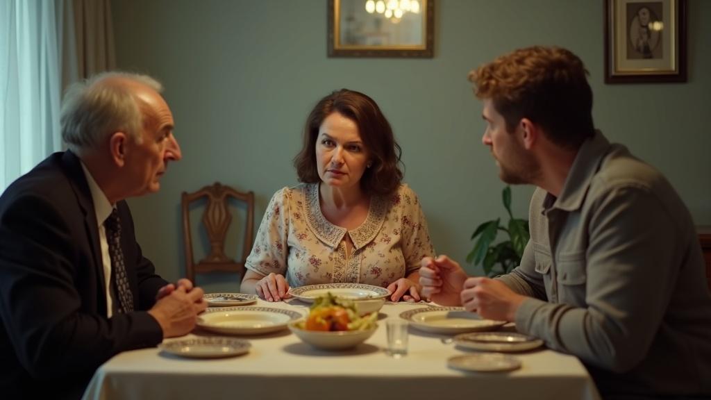 В столовой воцарилась мёртвая тишина. Роман Петрович медленно поднялся со стула, его лицо побагровело.