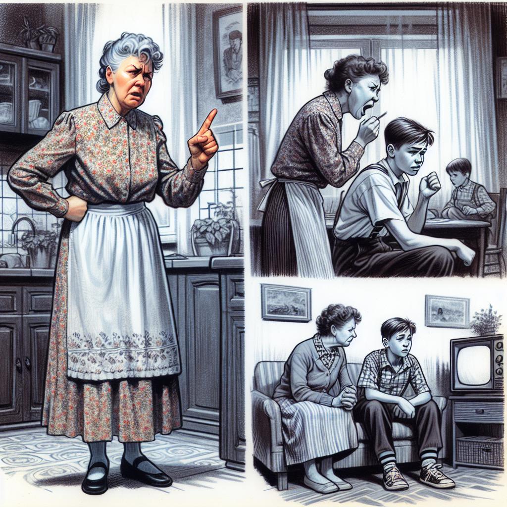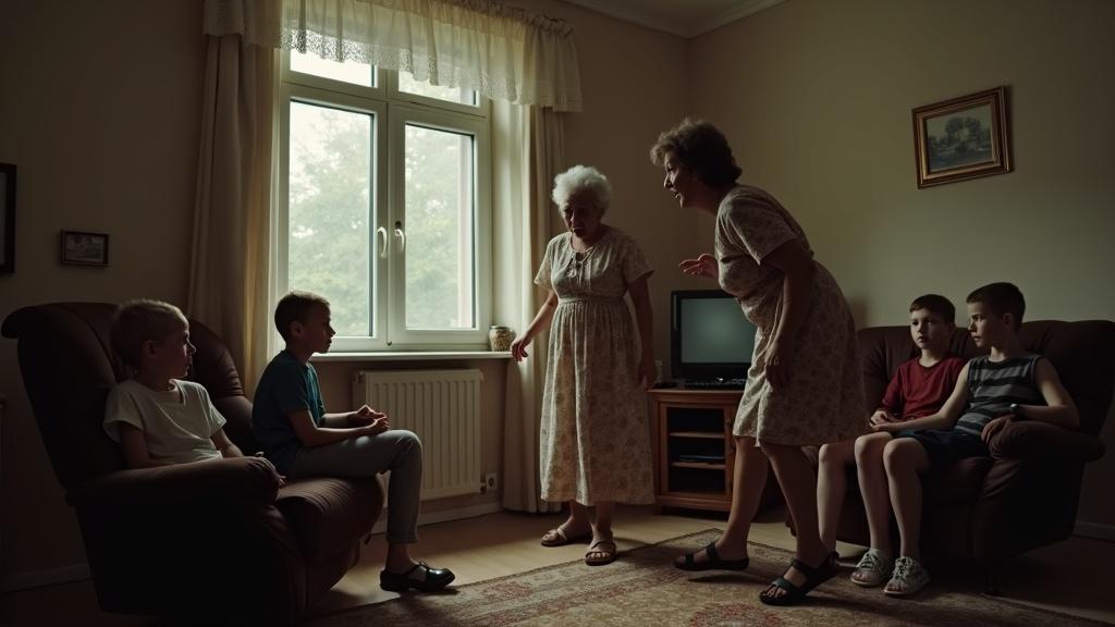 Внук прибежал из соседней комнаты, где с братом и сестрой смотрели телевизор.
