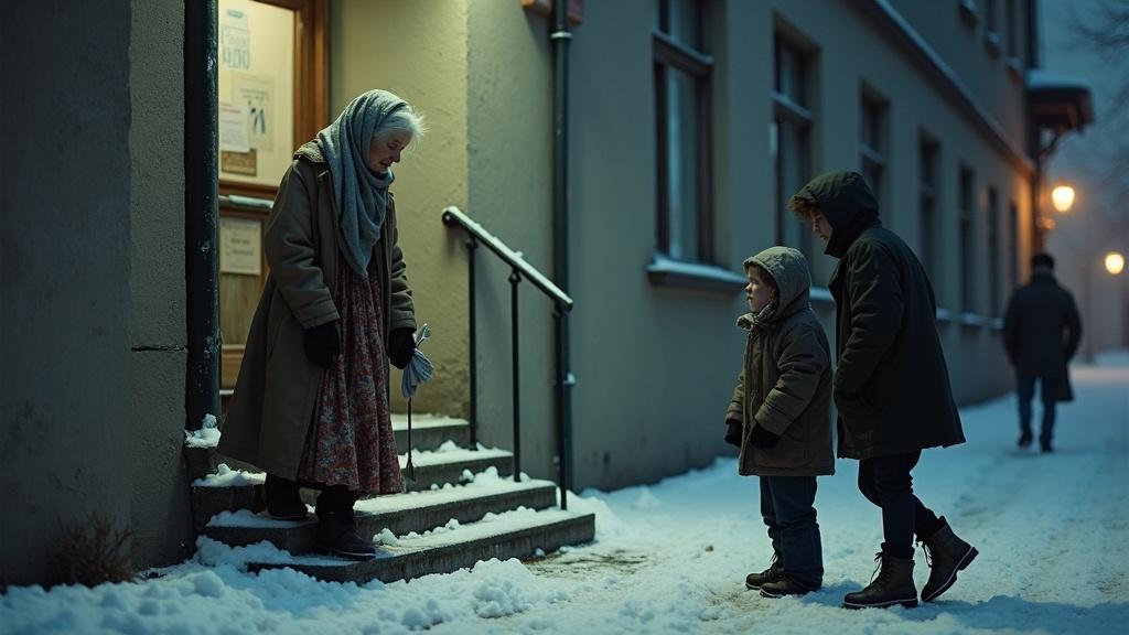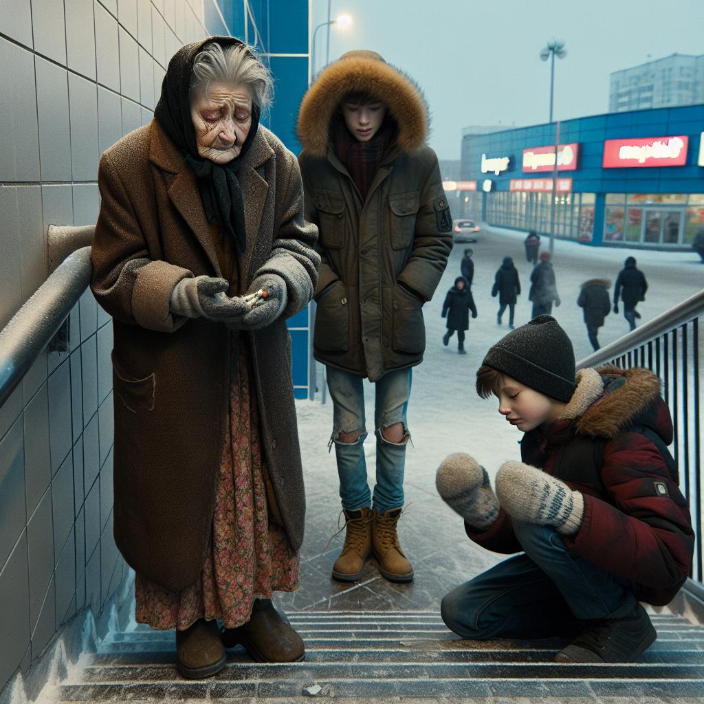 Морозным зимнем вечером старушка стояла у входа в большой супермаркет и просила милостыню. Лицо бабушки было всё морщинистое, руки дрожали, а в глазах была боль и обречённость. Одета она была бедненько. Хорошо поношенная куртка, которая была застёгнута не на все пуговицы, из-под неё виднелся халатик в цветочек, явно переношенные бурки и на голове совсем тонкий платок.