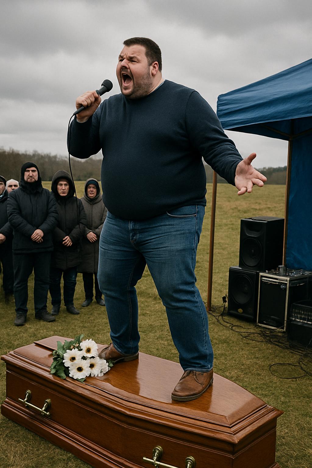 Один из присутствующих, который всё это время стоял чуть в стороне, подошёл ближе. В руках он держал странный предмет — позже все поняли, что это был микрофон. Не сказав ни слова, мужчина вдруг вскочил прямо на крышку гроба, и в тот же момент из колонок зазвучала весёлая ритмичная песня. Он начал петь и немного танцевать на гробе, улыбаясь, словно он не на похоронах, а на празднике.