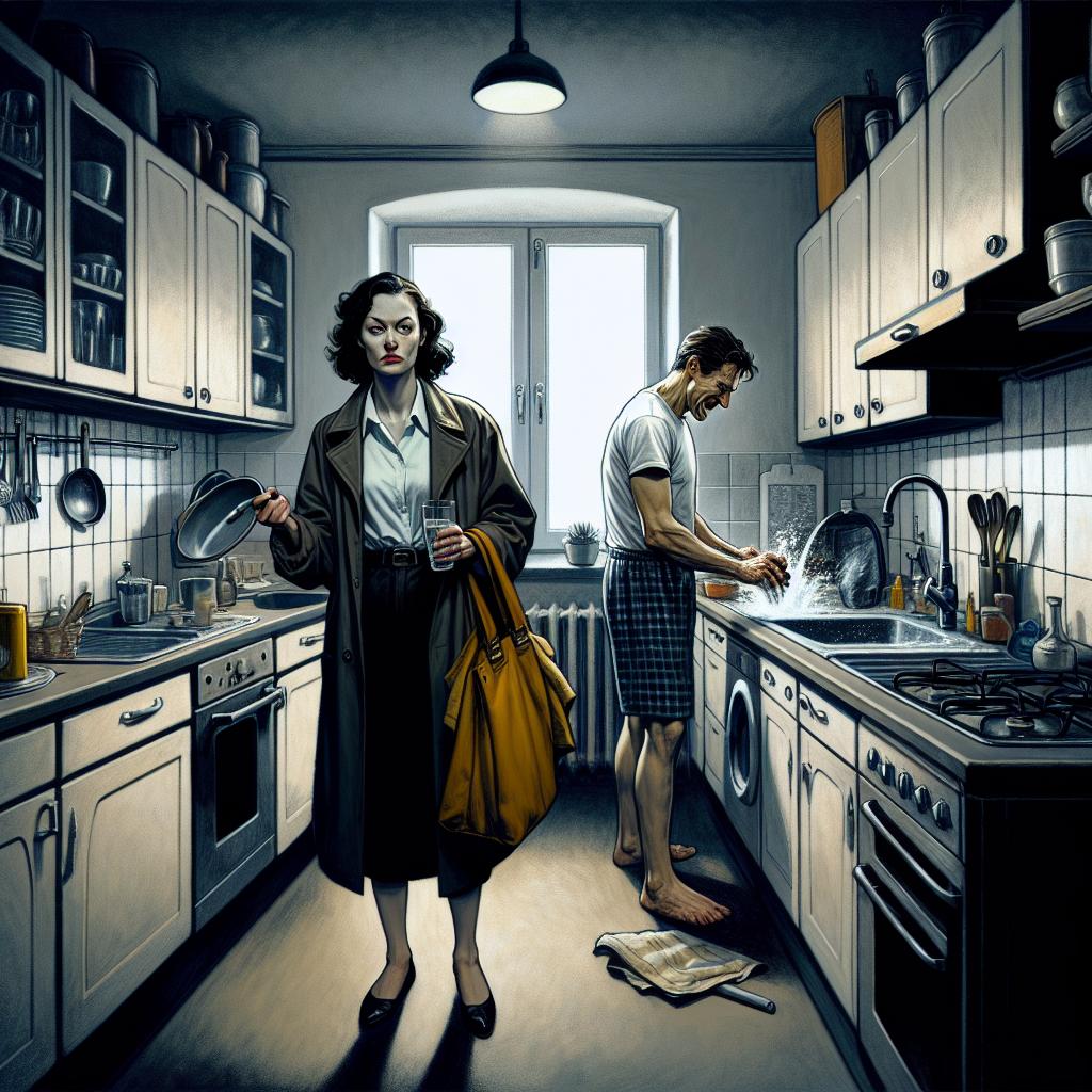 Он стоял у мойки — в футболке и домашних шортах, с недовольным лицом, словно перед ним не жена, а подчинённая.