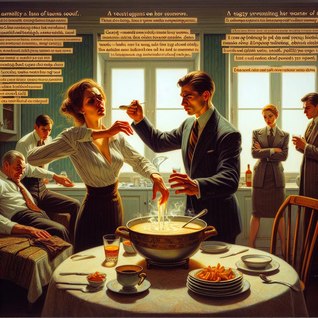 В этот момент супница опрокинулась. Горячий борщ хлынул прямо на Аллу, облив ее платье.