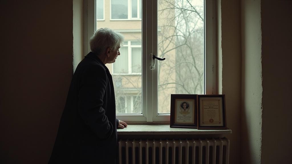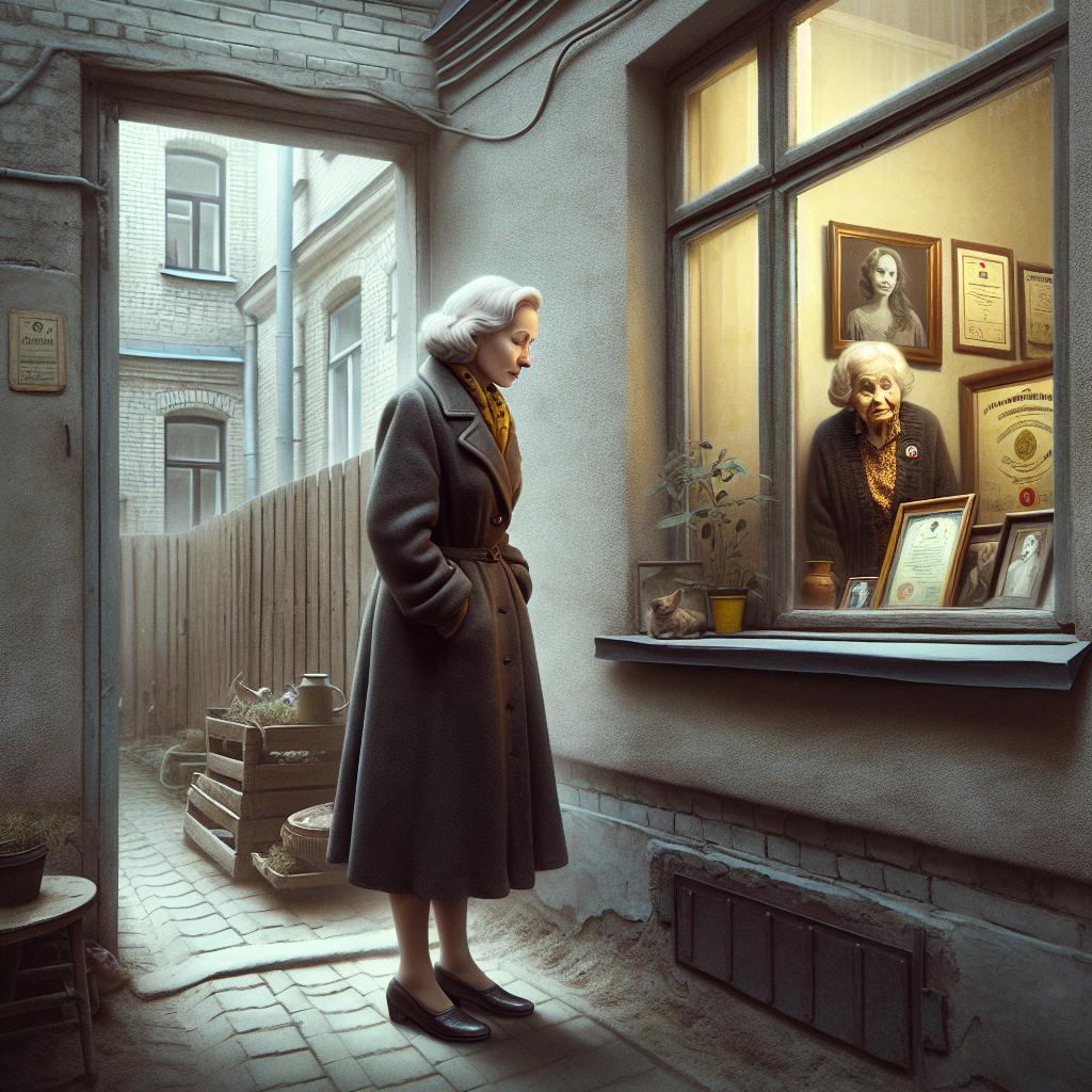 Вот она жизнь. Старушка, словно ребёнок, выставила напоказ самое дорогое, что у неё осталось — грамоту. И свой прекрасный портрет.