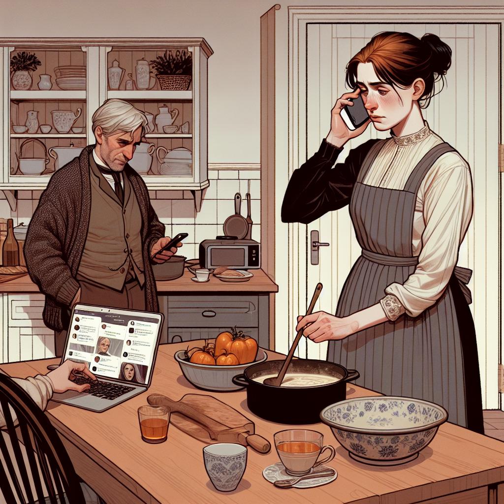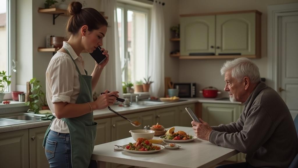 Надежда замерла с телефоном у уха. Кровь прилила к щекам. Она стояла на кухне своей квартиры, в руке держала половник, готовясь разлить суп по тарелкам. За столом сидел Пётр, уткнувшийся в телефон. Он даже не поднял головы.