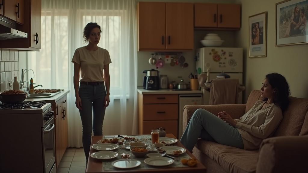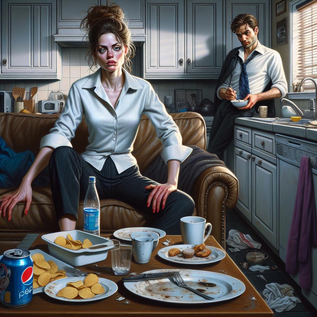 Альбина замерла на пороге кухни, глядя на гору немытой посуды в раковине. Тарелки с остатками еды громоздились одна на другой, на столе валялись крошки, а на плите застыли пятна от утреннего завтрака.
