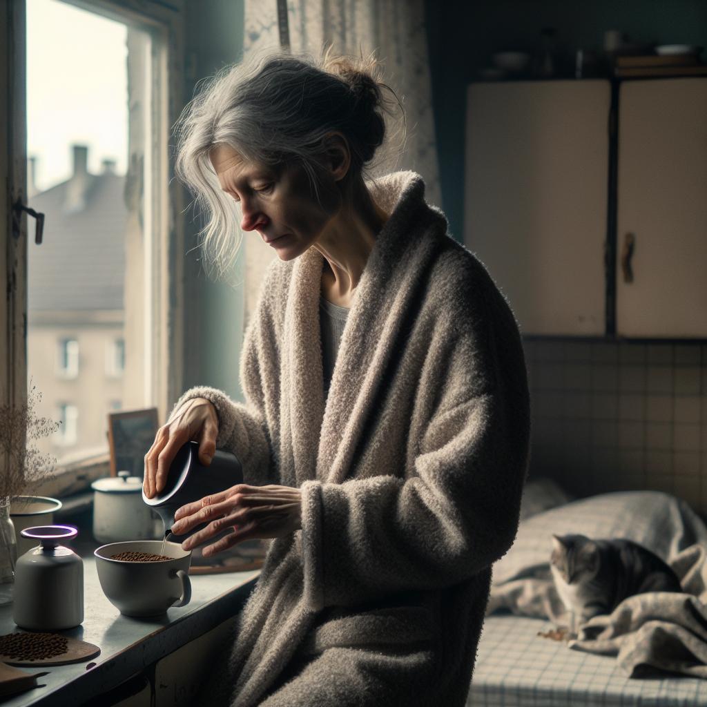 Она встала, накинула старый махровый халат, который давно потерял форму, и пошла на кухню. Навстречу ей, как всегда, важно вышагивая, появился рыжий кот.