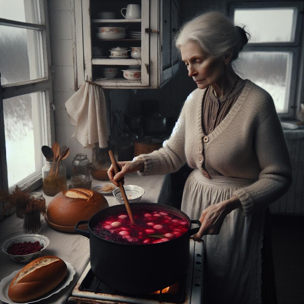 Елена стояла у плиты, помешивая борщ. Пламя под кастрюлей было убавлено до минимума, так что красноватые пузырьки лениво поднимались вверх и лопались у поверхности. В кухне пахло чесноком, лавровым листом, свёклой и свежим хлебом — буханка только что вышла из духовки, корочка потрескивала, остывая. За окном серело: короткий зимний день клонится к вечеру, на стекло налипали мокрые снежинки и медленно сползали вниз.