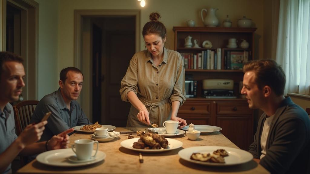 Её голос потонул в новом взрыве хохота. Она поймала своё отражение в зеркале прихожей, пока шла на кухню. Уставшее лицо без косметики, выбившаяся прядь из наспех скрученного пучка, старенький домашний костюм, который она носила уже лет пять. «Удобно и не жалко», — так она обычно оправдывала свой внешний вид. Но сегодня, глядя на себя, она увидела не хозяйку дома, а тень. Обслуживающий персонал без права голоса.