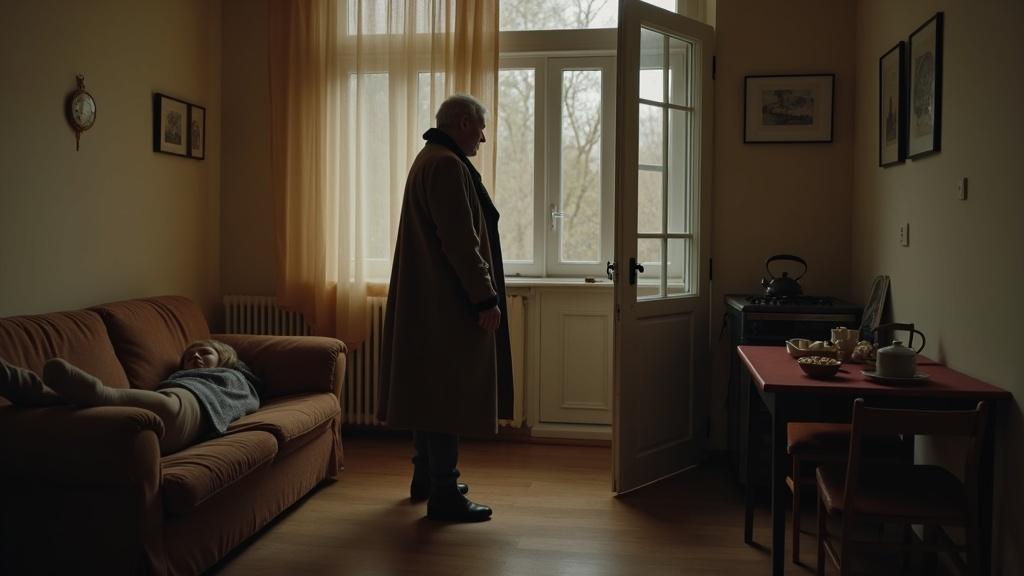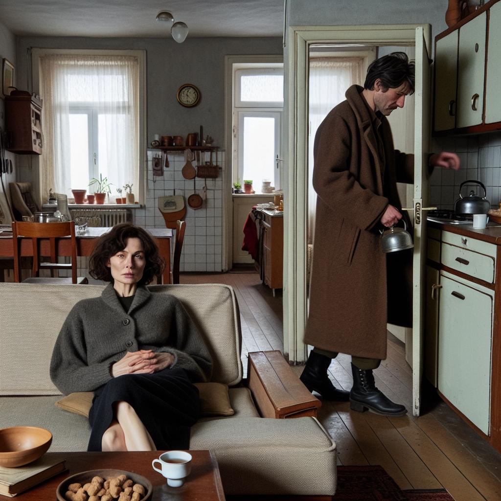 Николай кое-как обулся, сорвал с вешалки пальто и подошёл к двери. Долго возился с замком, наконец, отпер дверь и вышел на площадку. За ним по полу тянулся шарф, свесившийся из рукава пальто. Он обернулся, хотел что-то сказать, но Нина захлопнула перед ним дверь.
