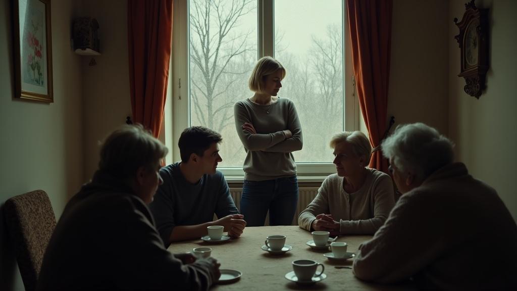 Сергей, ее муж, сидел за обеденным столом, уставившись в свою чашку с остывшим чаем, и пальцы его нервно барабанили по краю блюдца. Рядом с ним расположилась его сестра Ольга — женщина лет сорока пяти, с аккуратно уложенными волосами и взглядом, который мог бы растопить лед, если бы не был направлен сейчас на Катю с таким явным осуждением. А напротив Ольги устроилась тетя Валя, мать Сергея, пожилая дама с вечной вязаной шалью на плечах и привычкой комментировать каждое слово окружающих, словно ведущая ток-шоу. Они приехали час назад, якобы «на минутку, просто чаю попить», но «минутка» растянулась на два часа, а теперь, когда Катя наконец-то собралась с духом и поставила точку, воздух в комнате стал густым, как сироп.