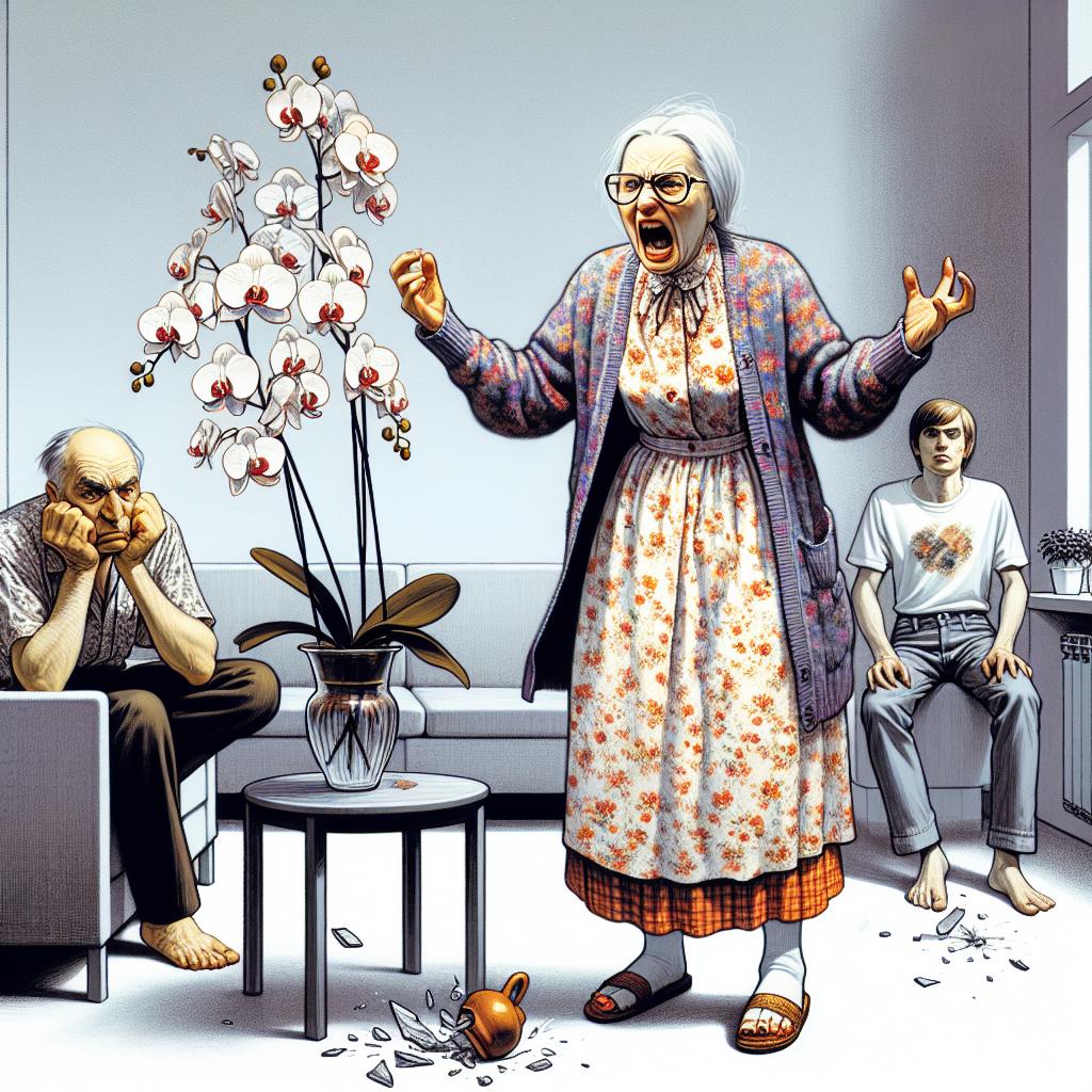 Стеклянная ваза с орхидеями полетела прямо в стену, разбиваясь на тысячу осколков.