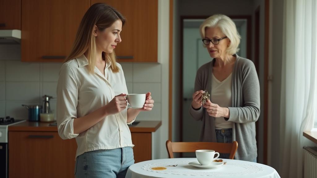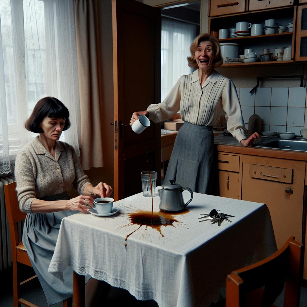 Татьяна замерла с чашкой кофе в руках. Её руки задрожали, и горячая жидкость пролилась на белую скатерть. Она смотрела на Галину Петровну, которая стояла в дверном проёме с ключами от квартиры в руке и победной улыбкой на лице.