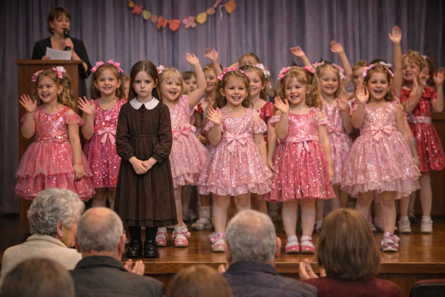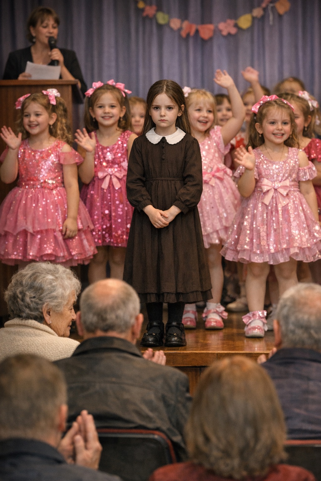 Я посмотрела. На сцене стояло двадцать, может быть, двадцать пять девочек. Аккуратно выстроены в ряды. Огни прожекторов их освещали, и каждое платье сверкало, блистало, как будто это были не семилетние дети, а феи. Розовые, голубые, жёлтые, фиолетовые — карнавал цветов. Каждая девочка другая, уникальная, особенная. Махали родителям. Улыбались. Хихикали. Некоторые озорно толкались, другие пытались стоять серьёзно, по-взрослому.
