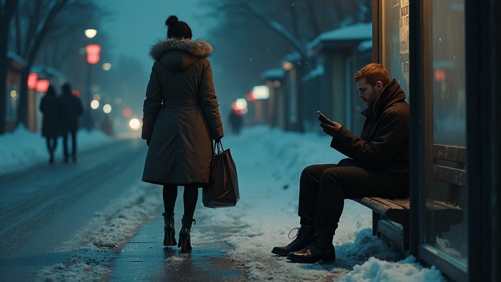Она достала из сумочки телефон и посветила фонариком вглубь остановки. В глаза сразу бросилось чёрное пальто и блестящие модные ботинки. Бомжи так не одеваются.