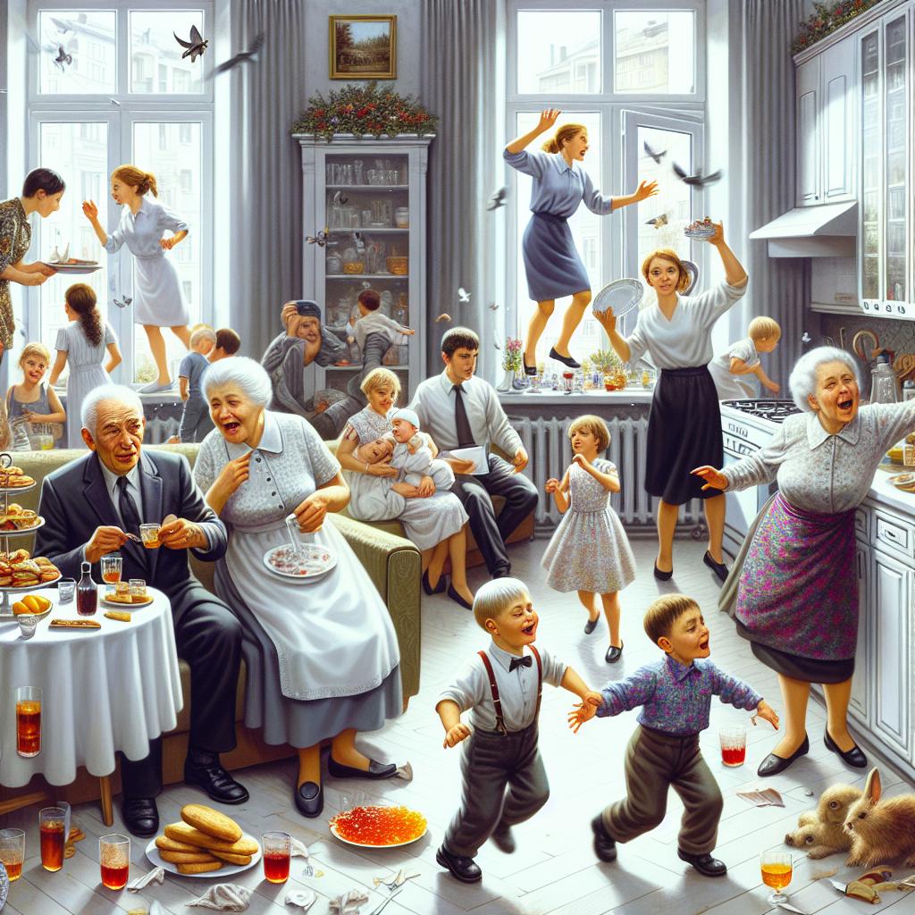 Гостиная была похожа на вокзал в час пик. Двадцать человек – тёти, дяди, двоюродные братья, их жёны и дети – заполнили каждый сантиметр пространства. Тётя Лариса, в ярко-розовом платье, громко рассказывала анекдот, заглушая телевизор, который кто-то включил на полную громкость. Дядя Витя, с красным от жары лицом, пытался открыть окно, но оно, как назло, заело. Дети – четверо племянников и чьи-то ещё малыши – носились между взрослыми, роняя крошки на ковёр. Маша, обычно спокойная, подхватила общий настрой и теперь прыгала на диване, размахивая игрушечным пони.