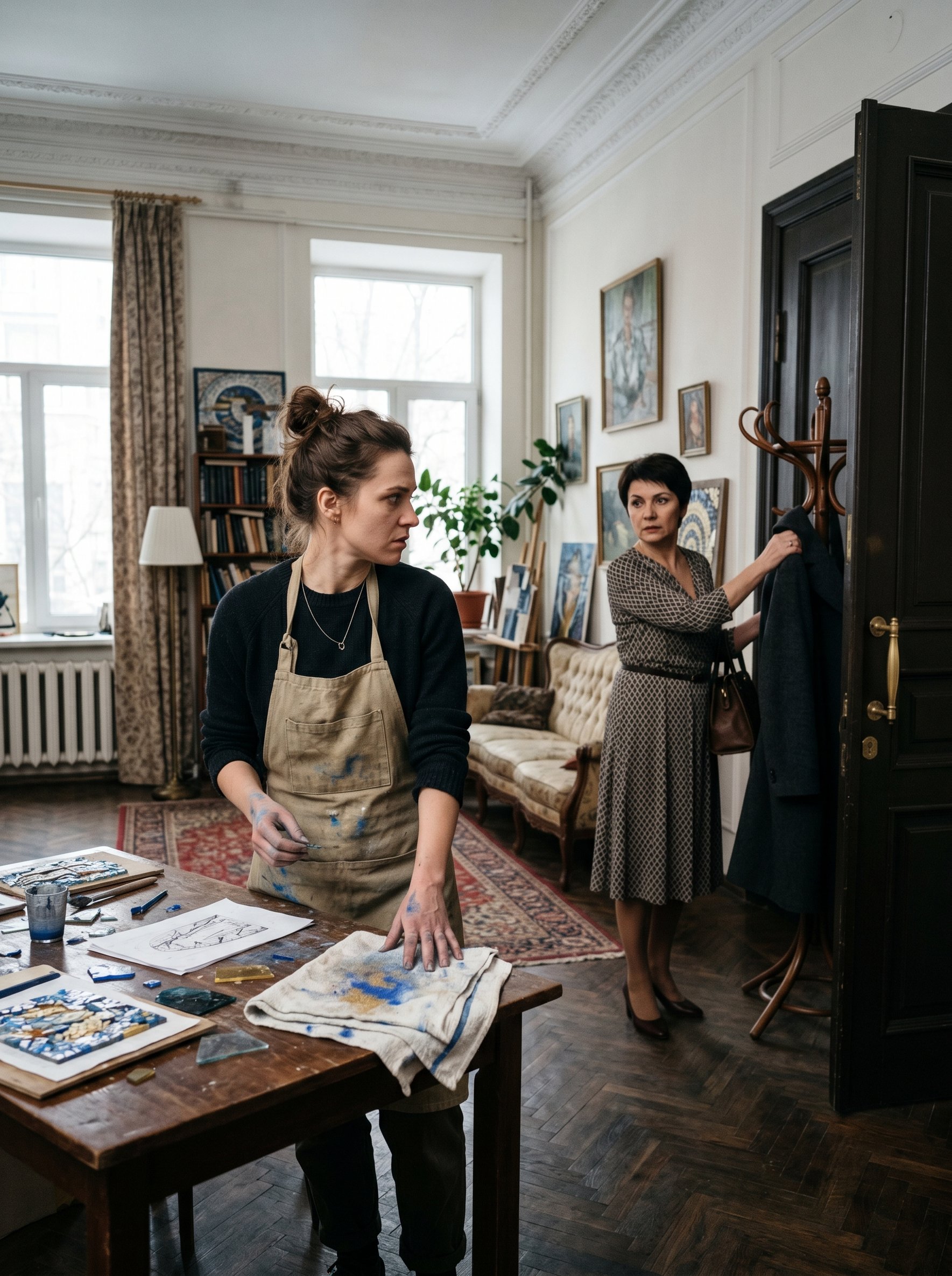 — Мам, ты ещё обувь не сняла, а уже распоряжаешься моей квартирой? — Оксана стояла на пороге кухни, вытирая ладони полотенцем, испачканным следами смальты. — Можно узнать, к чему такие заявления прямо с порога?